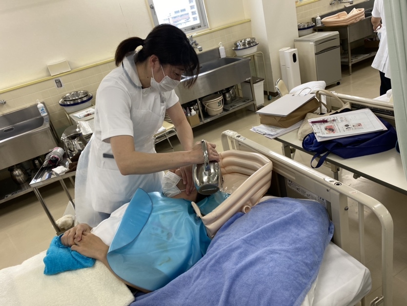 1年生は洗髪の演習をしました。入学してから数々の技術を学んできましたがこの洗髪は清潔援助の中でも難しい技術の一つです。初めてでしたので、耳に水をかけてしまったり背中を濡らしてしまったりと失敗もありました。しかし、練習あるのみ!