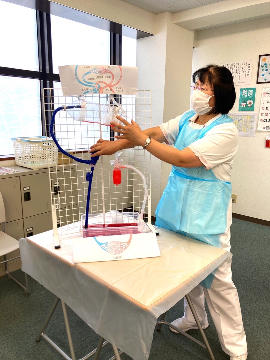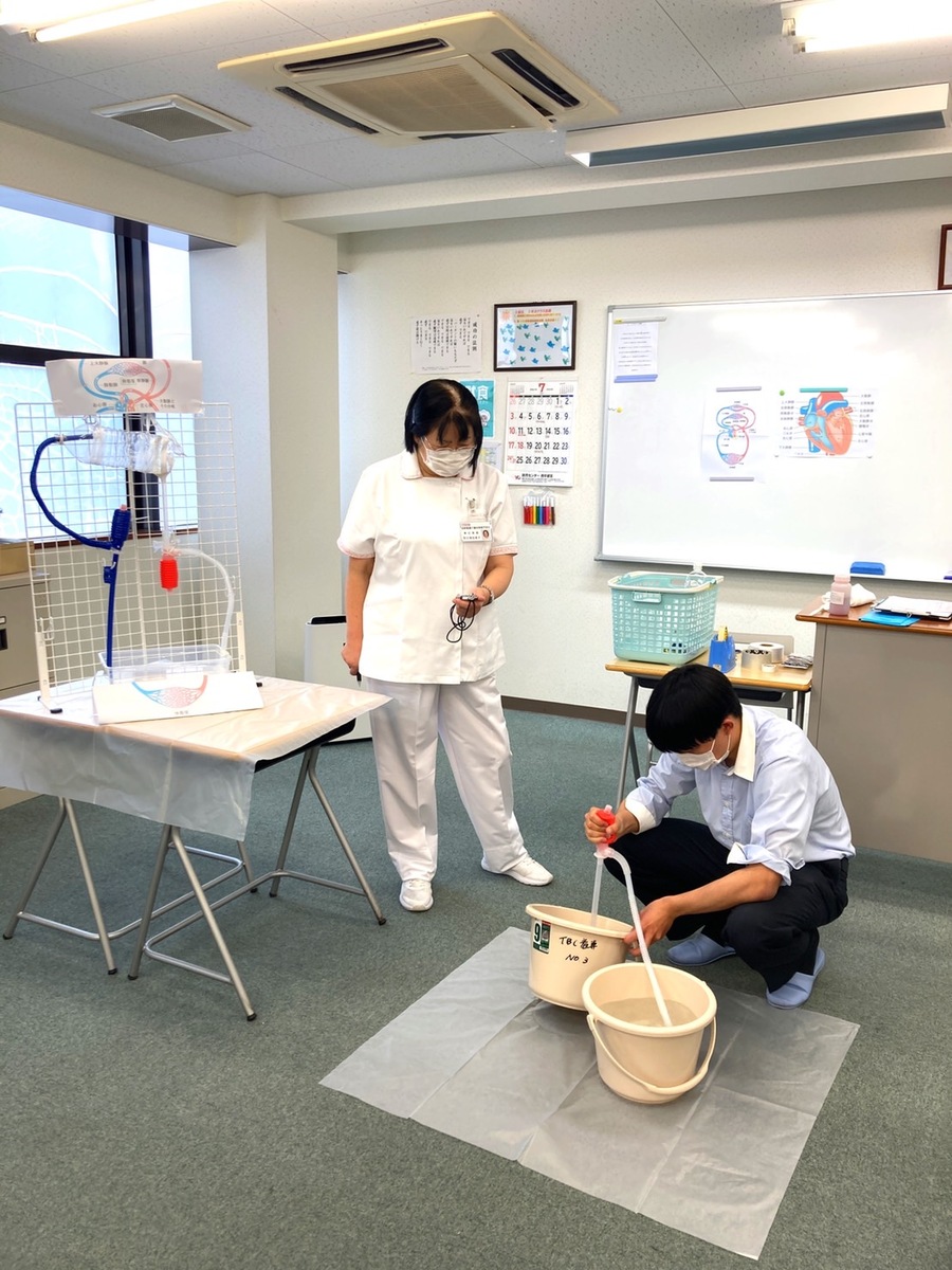 ということで…血液に見立てた5リットルの水。これを移動させるのに何分かかるかタイムアタック!