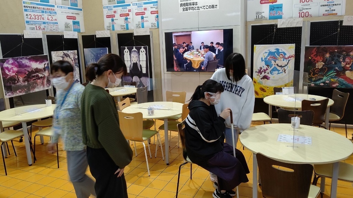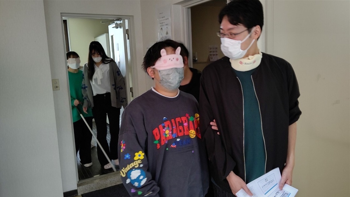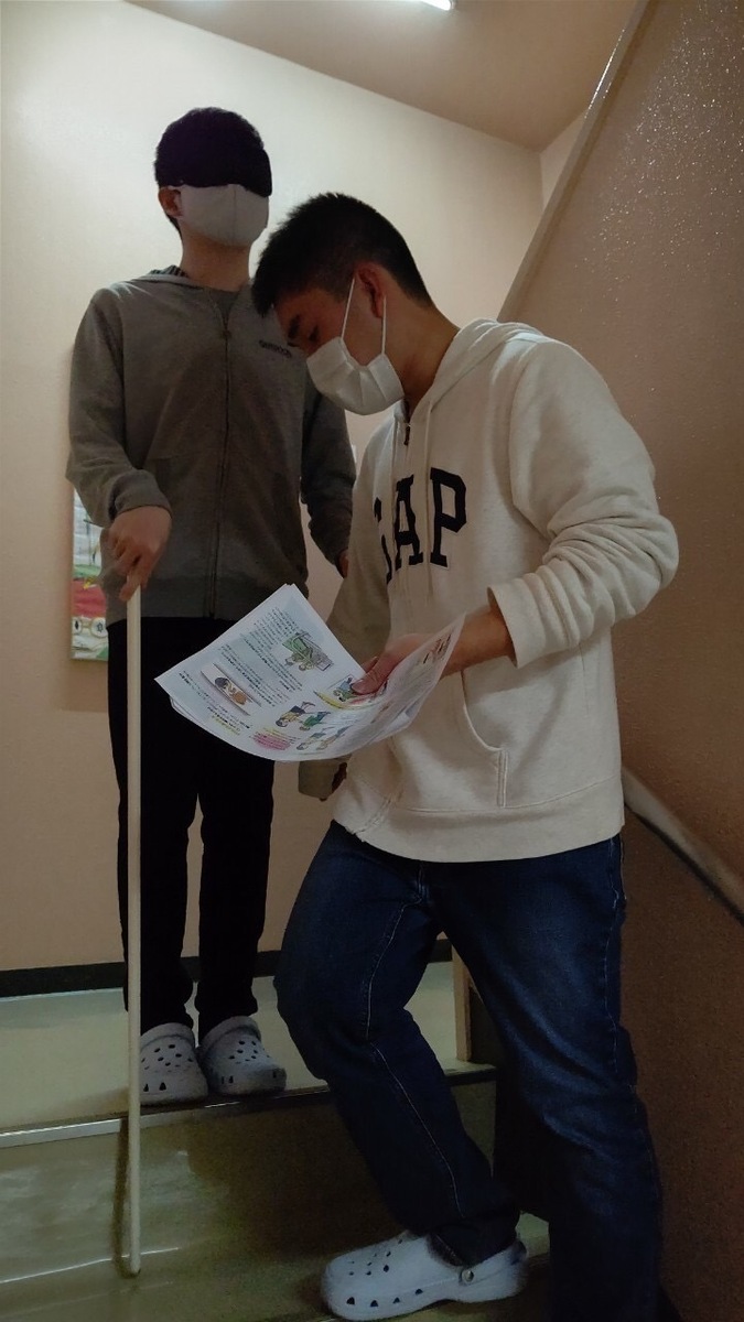 体験はペアで行い、一人はアイマスクに白状を持ち、もう一人はその学生の誘導介助を行います!エレベーターに乗ったり、階段を下りたり、トイレに行ったり・・・耳を澄ましたり、においを嗅いだり、手で感じたり・・・視覚に障がいを持っている方の気持ちに少し近づいてみて、どのように介助したらいいのか学ぶことができました☺♥これからも介護についてたくさん勉強していきます!