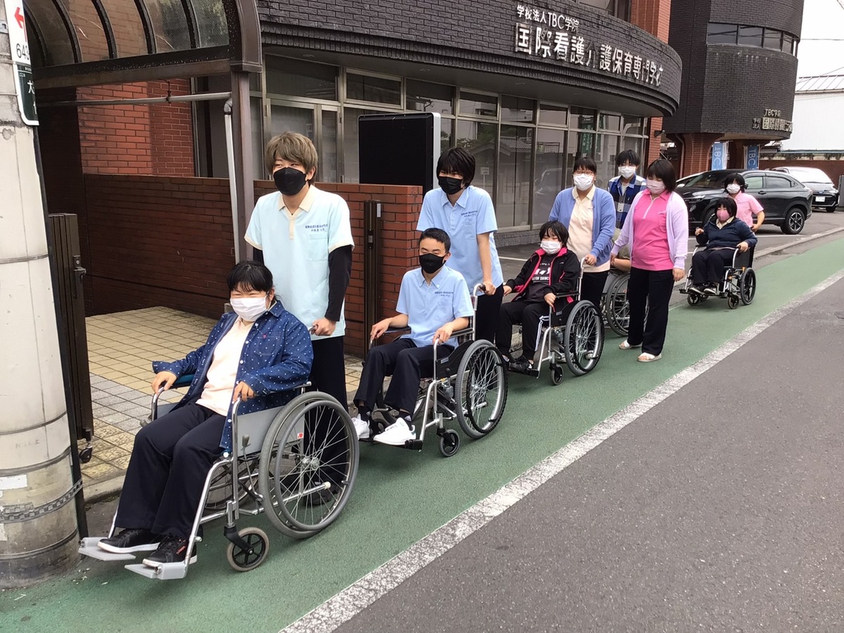 今日は生活支援技術の授業で『車いす体験』をしました♿天気がいいので近くの千波公園まで車いすで散歩に出かけました。実習室での体験はしましたが外での体験は今日が初めて。道路に傾斜があったり、デコボコ道だったり・・・公園は砂地になっていて車いすを押すのも一苦労。