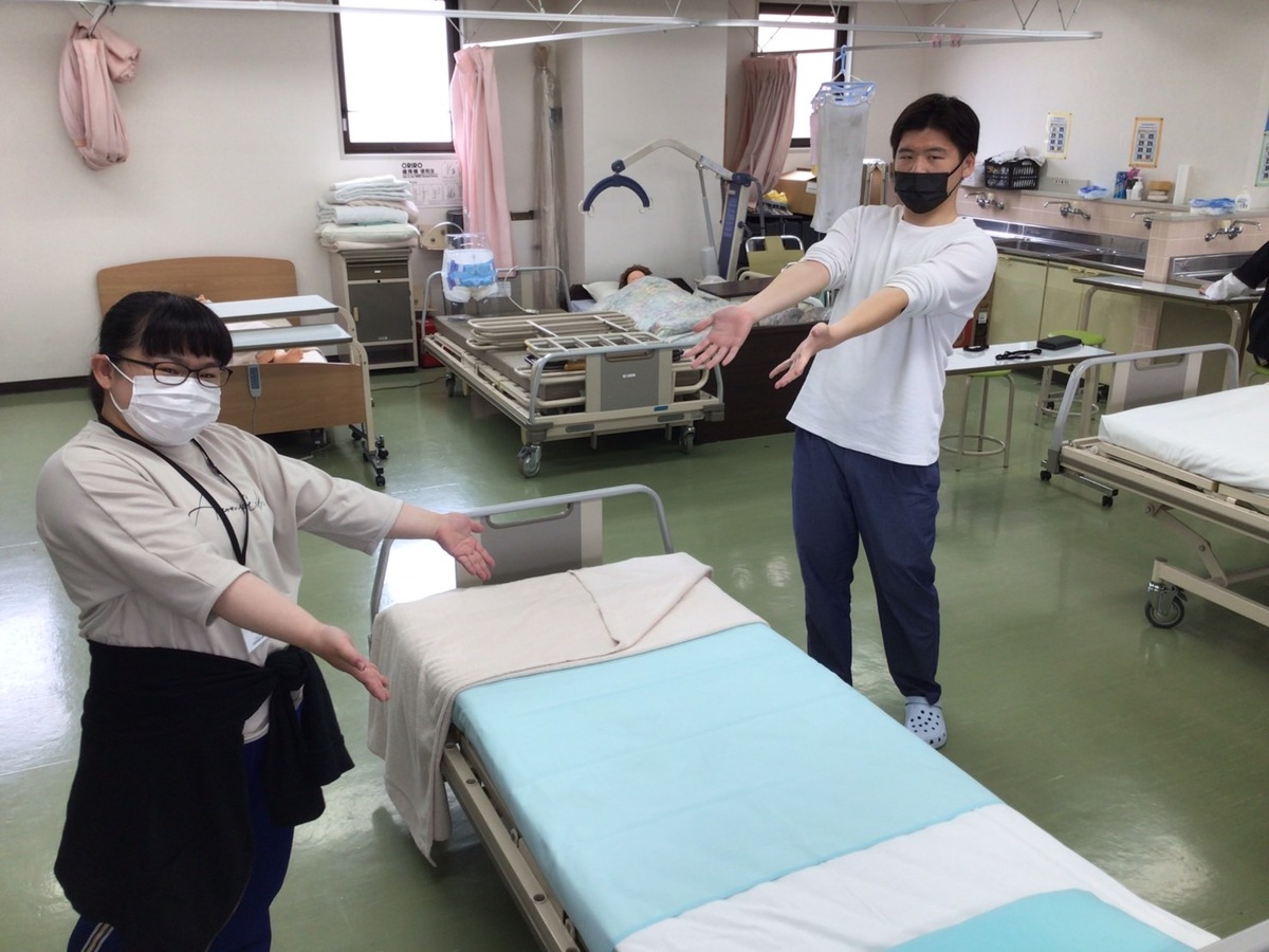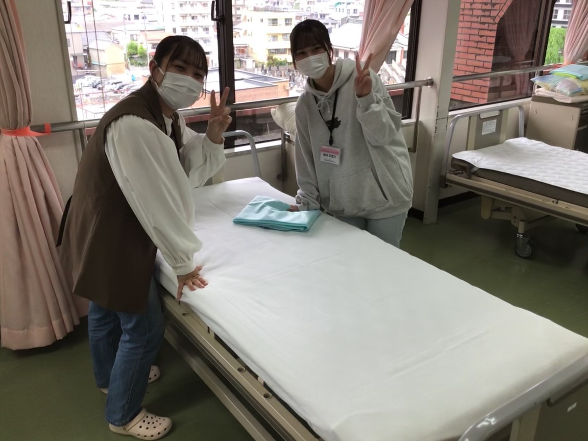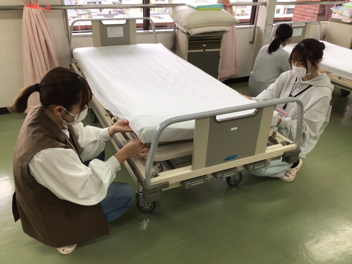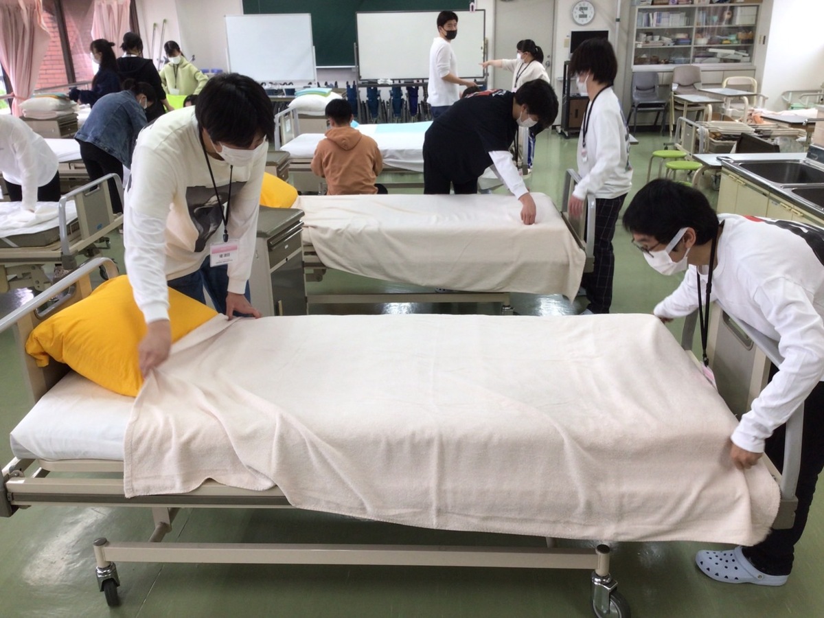 『生活支援技術』の授業ではじめてベッドメイキングを行いました!まだ、実習着がまだ出来上がっていないので、みんな動きやすい服装で行っています◎先生からベッドメイキングのコツを教わりながら2人ペアになって進めます。はじめてにしては上々の出来でしょ?介護士に向け一歩成長しました!✨