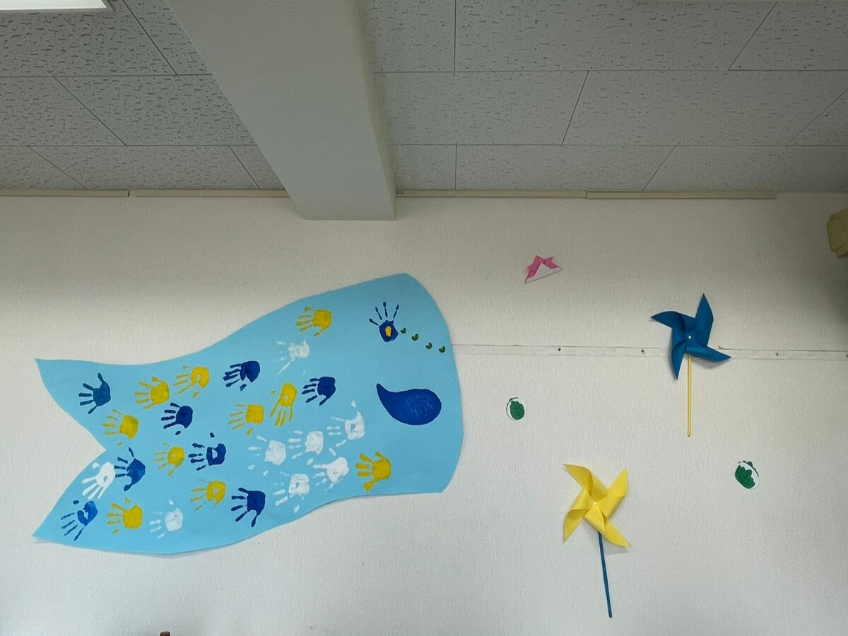 図画工作の授業でクラス全員の手形を押して大きなこいのぼりを作りました壁面係の学生が企画・準備・片付けまで行いました!