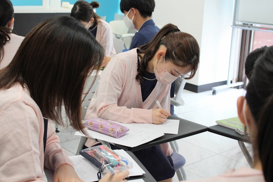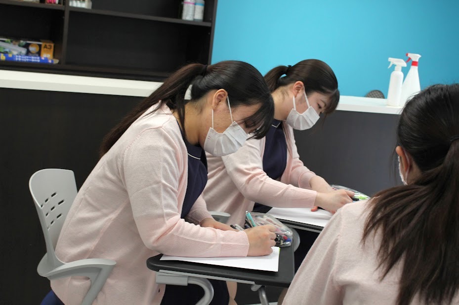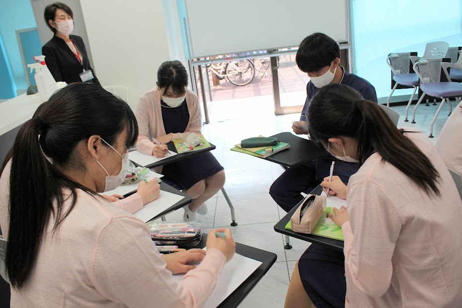 今日はグループで力をあわせて色々な意見を出し合い患者様の気持ちを考えどのようなサポートの仕方ができるかを考える授業でした❀