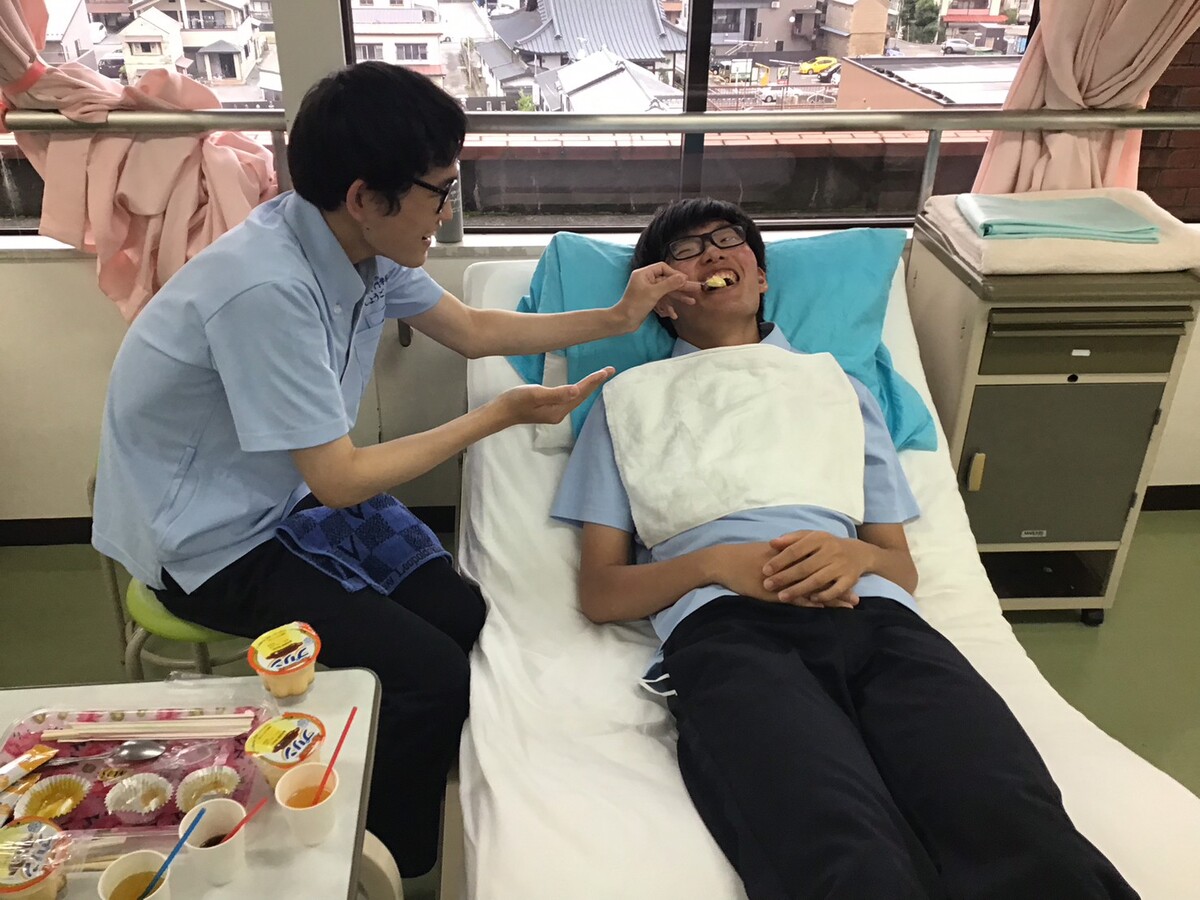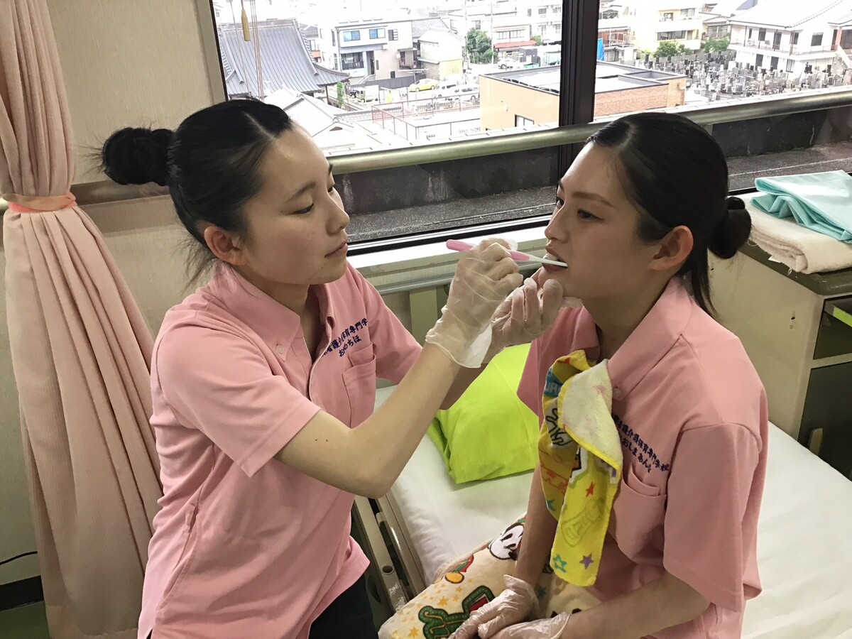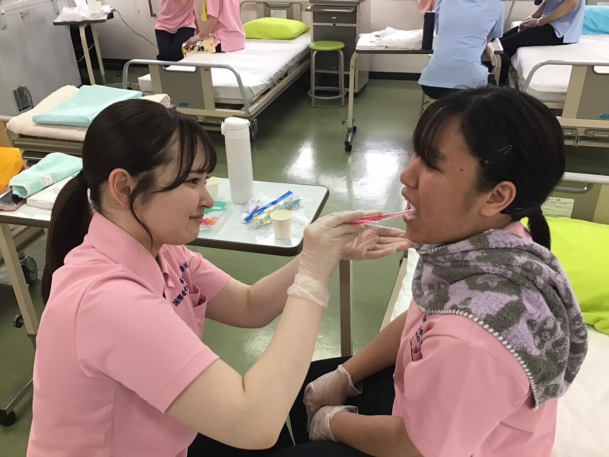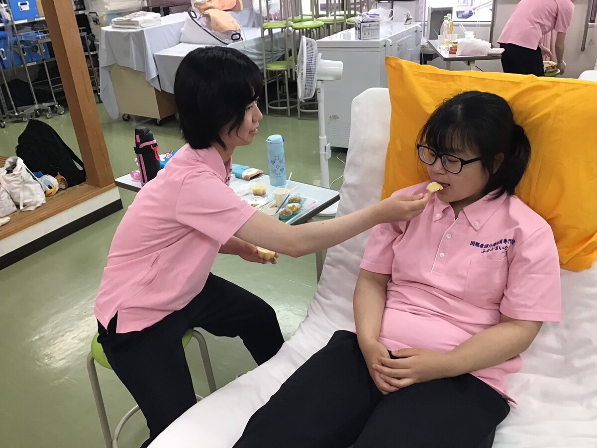 食事介助と口腔ケアの実習をしました。介助技術向上のための練習はもちろん、利用者役の学生は、介護食やとろみ付の飲み物を食べたり飲んだりして、ご利用者様の気持ちになれました。