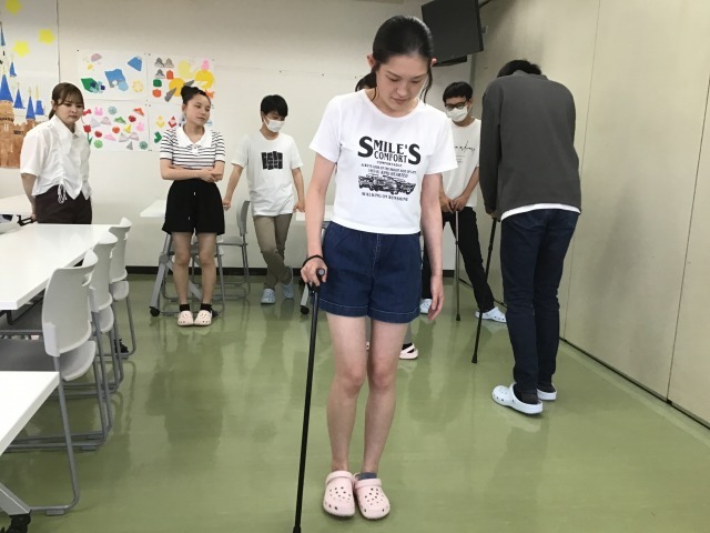 まずは、自分が杖が必要な状態になったと仮定した杖歩行の練習をしました。