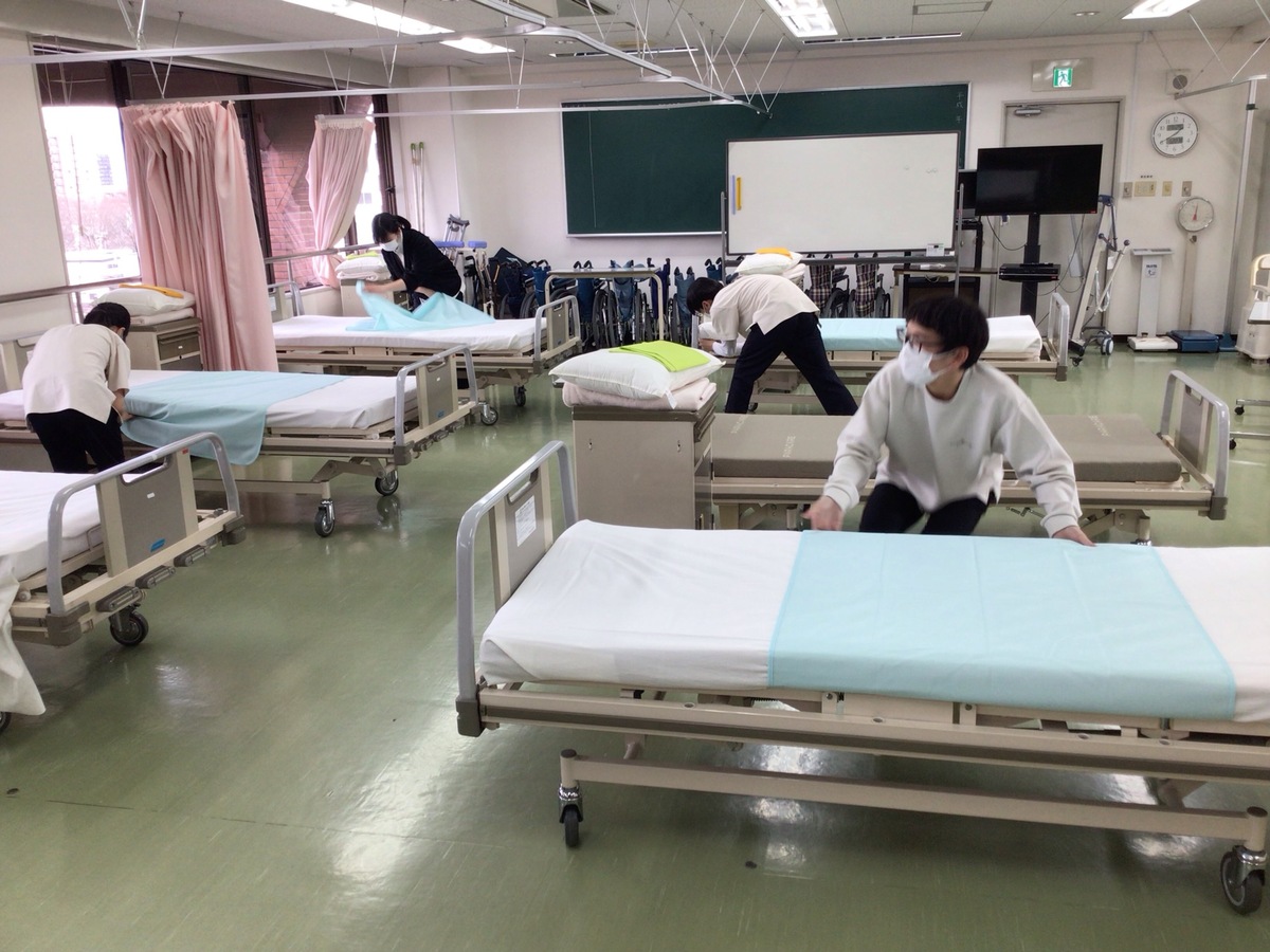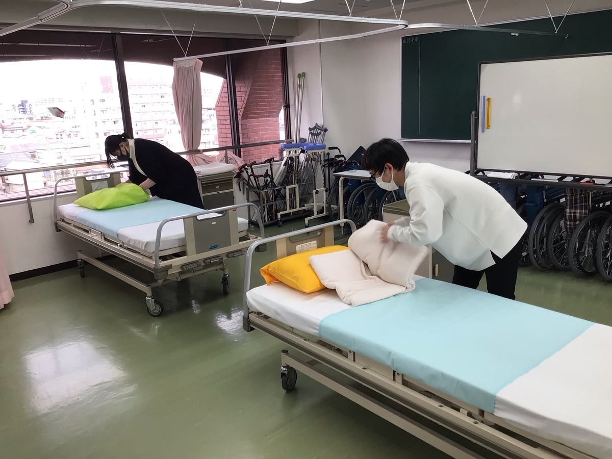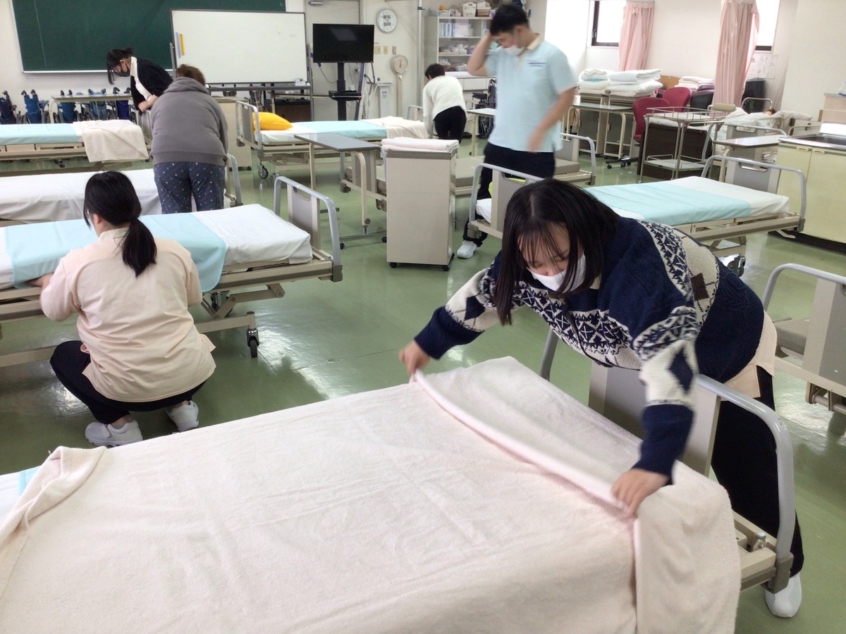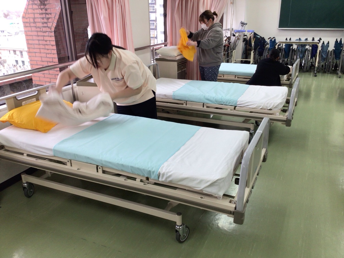 本日はその介護職初任者研修の実技試験対策としてベッドメイキングの確認を行いました。