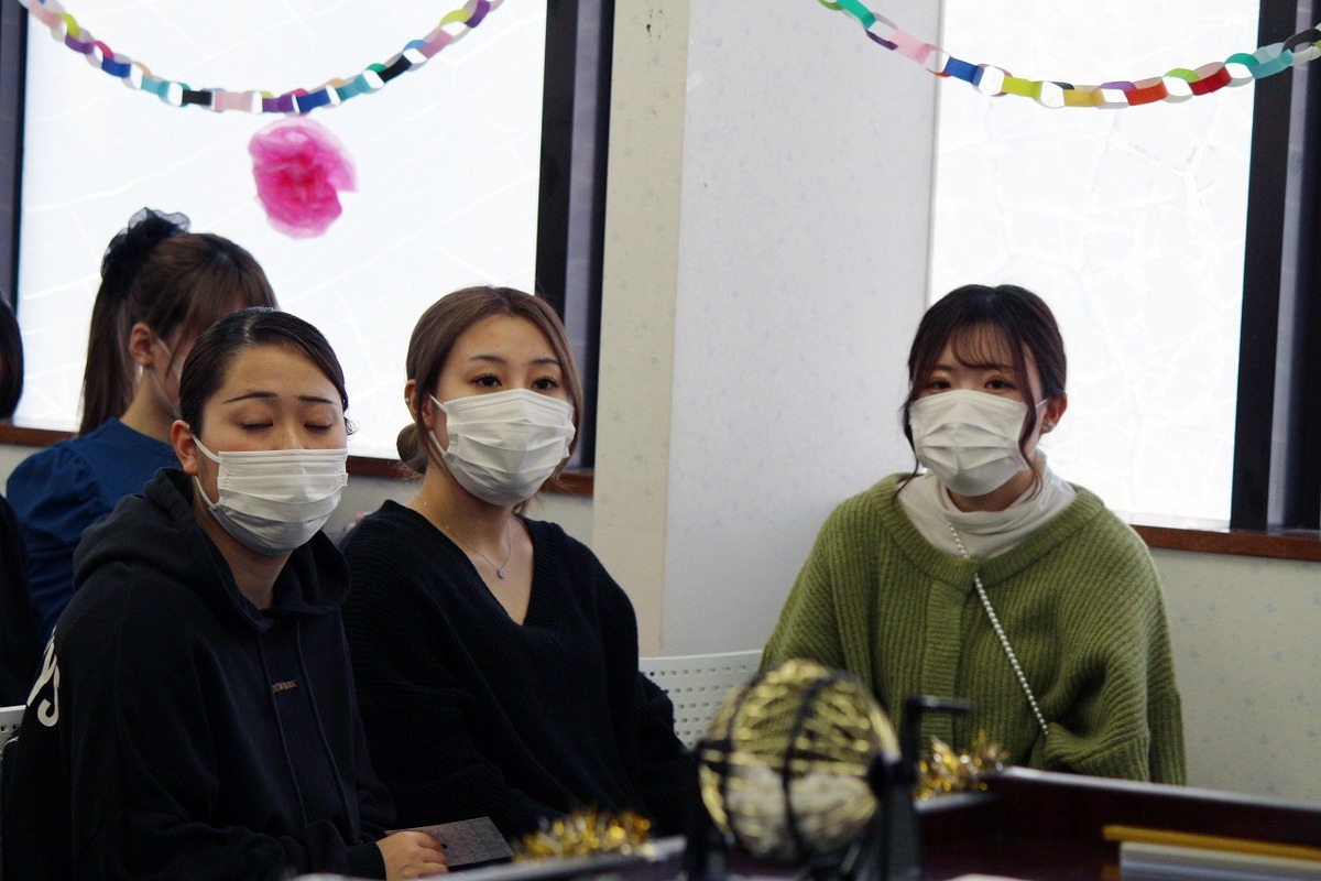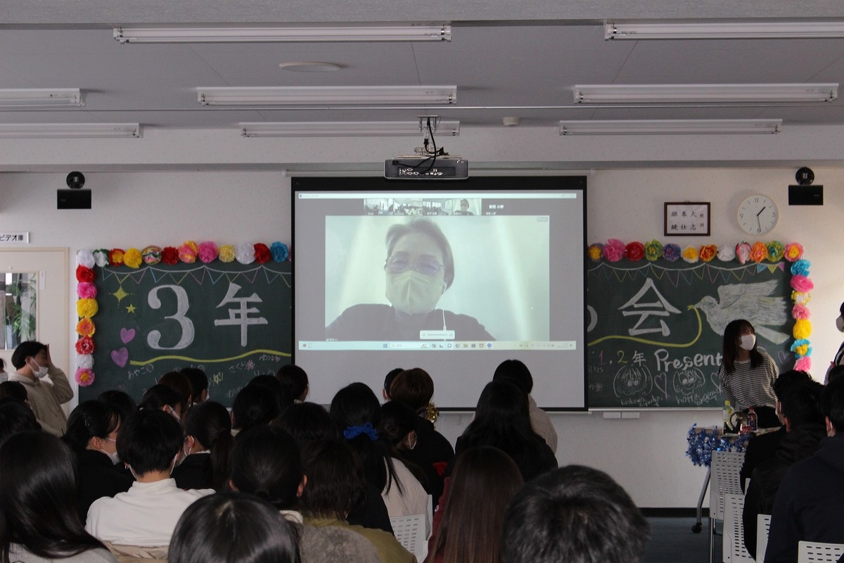 今回は、残念ながら出席できなかった校長先生もzoomでの挨拶、実行委員を中心に企画・準備したビンゴ大会、2年生代表学生から3年生への送る言葉3年生代表から1・2年生への励ましの言葉 など…。楽しい時間はあっという間に過ぎてしまいました。