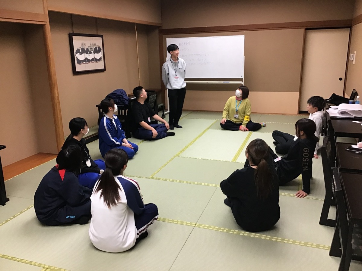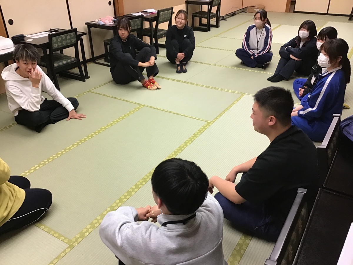 夜にはクラスごとに集まり、自己紹介や学びたいことなどを話し合う座談会が開かれました。初対面の仲間との交流を深める場として、和やかな雰囲気の中で意見交換が行われ、互いの理解が深まりました。