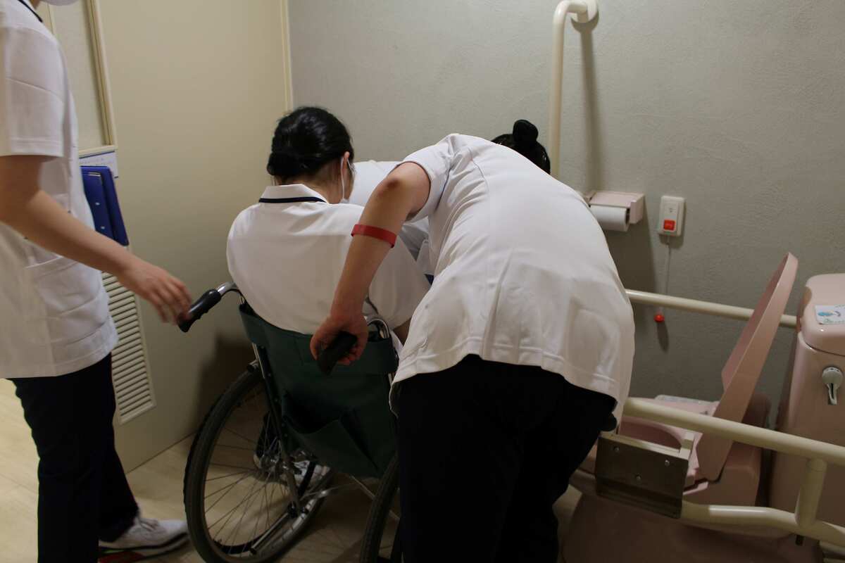 狭いトイレで車いすから便座への移動がどうしたら良いかわからず、みんな大苦戦していました。広いトイレばかりではないので、難しいですね。