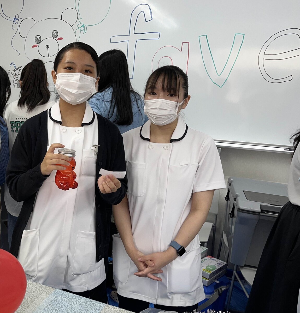 看護学科ではかわいいくまちゃんボトルに入ったドリンクを販売しました。