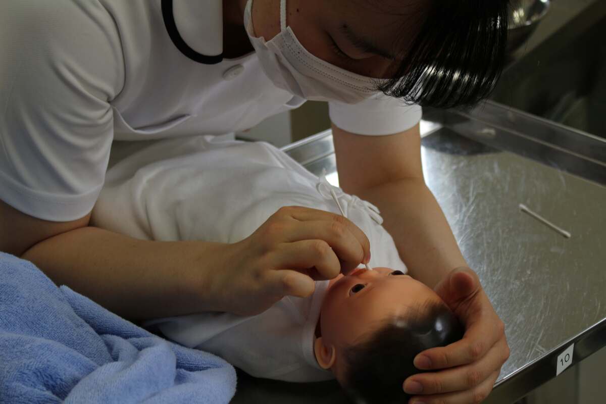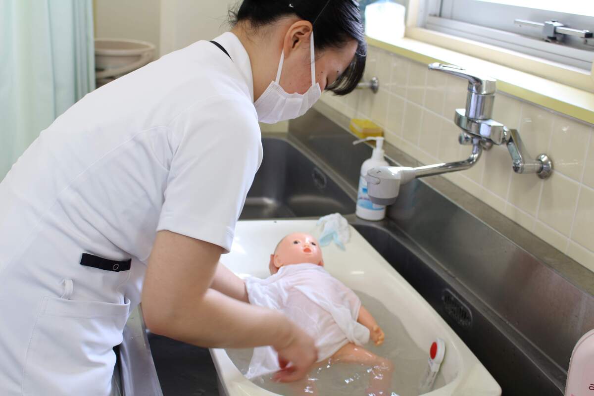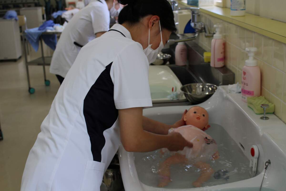 病院実習で実際に赤ちゃんの観察やお世話ができるように何回も何回も練習します。
