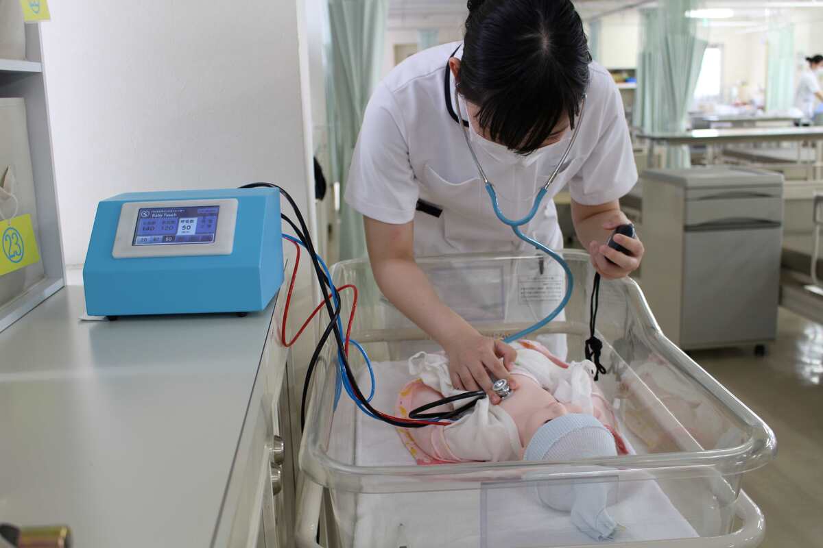 赤ちゃんのリアルな心音や呼吸が測れるバイタルサインシュミレーターを使って、胸の音の聴診のしかた、脈の取り方、直腸検温の仕方も学びます。