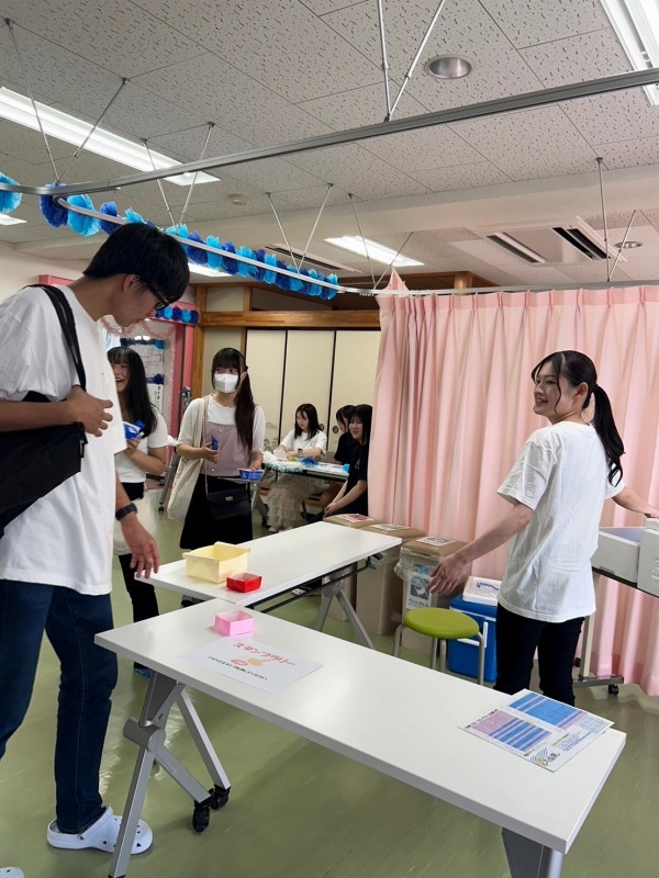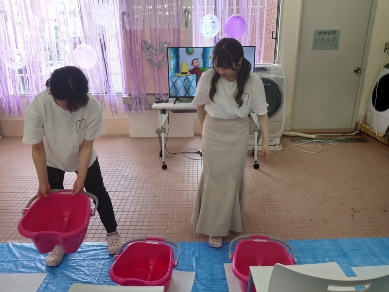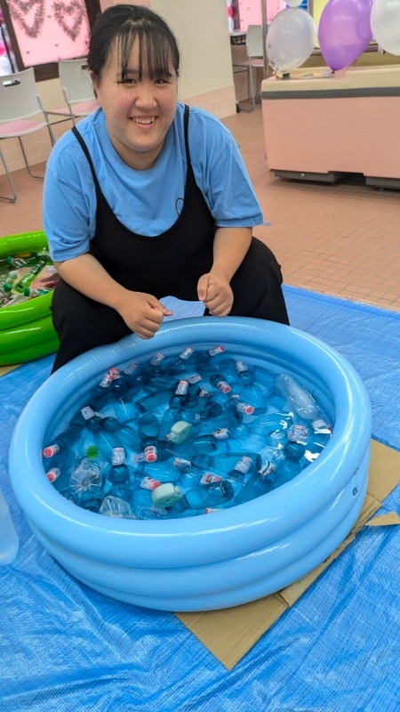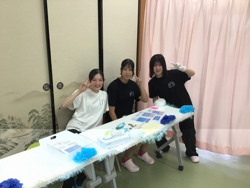介護福祉学科と福祉総合学科は今年の出し物は、「足湯」と「ラムネなどのジュース販売」、それから「介護福祉機器や学科の様子の展示」そして、「アイスとオレオを混ぜて食べながら休憩処」という催しをしました。