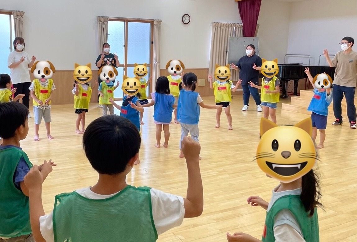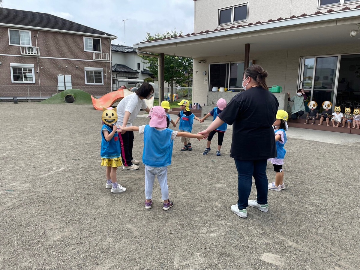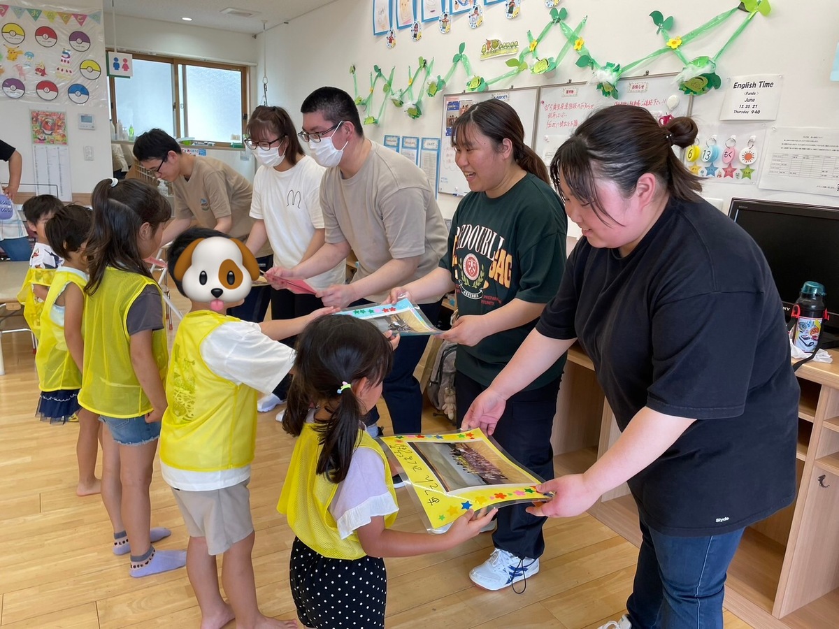 保育園ではたくさんの園児たちと触れ合い、「輪っかくぐり」や「猛獣狩りに行こうよ♪」「うめぼし体操」を一緒に歌ったり、踊ったり楽しい時間を過ごしました。